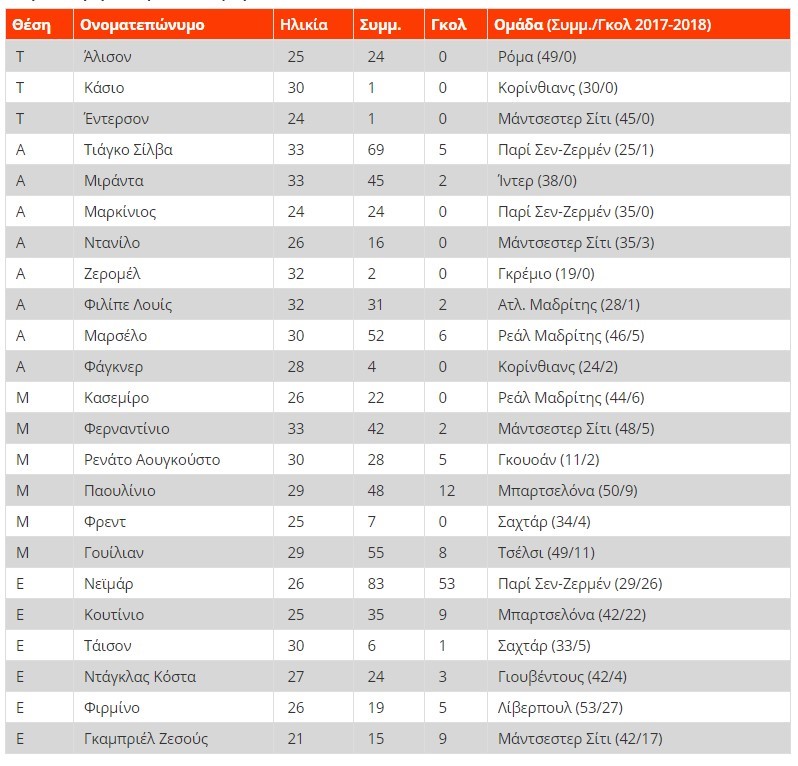Ρόστερ της Εθνικής Βραζιλίας στο Μουντιαλ 2018