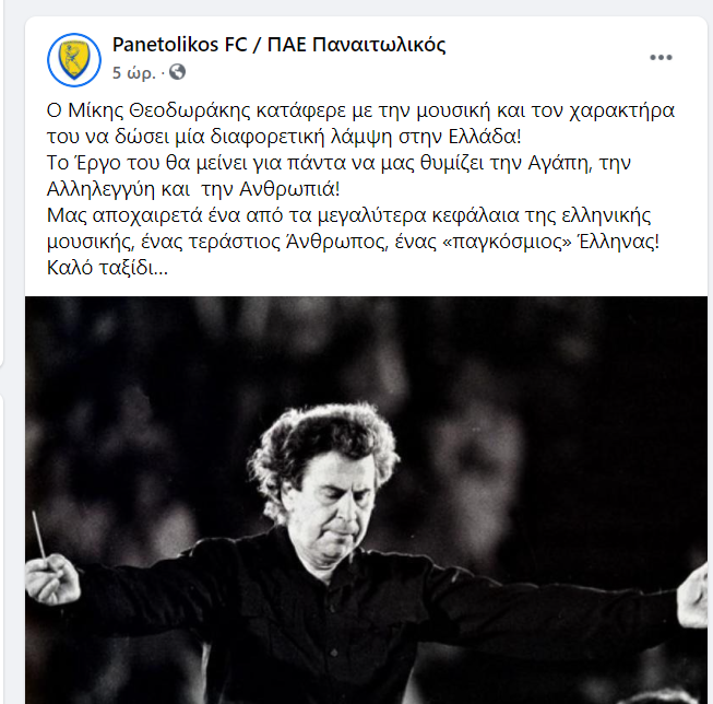 Η ανάρτηση της ΠΑΕ Παναιτωλικός γα τον Μίκη Θεοδωράκη αναφέρει τα εξής: