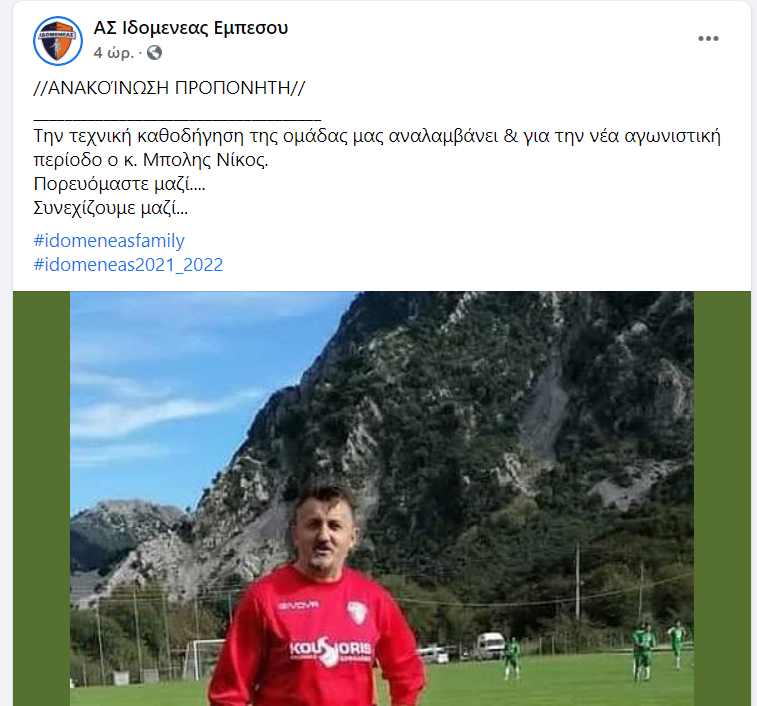 Ο Νίκος Μπόλης θα παραμείνει στον πάγκο του Ιδομενέα Εμπεσού σύμφωνα με την ανακοίνωση του συλλόγου που αναφέρει χαρακτηριστικά.
