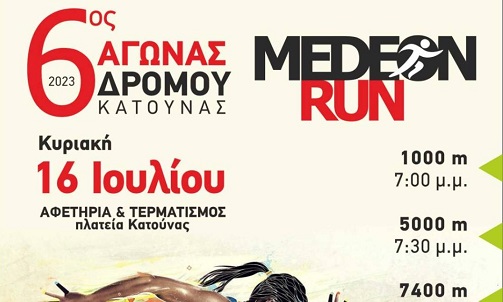 Το Κέντρο Δημιουργικής Απασχόλησης Παιδιών Κ.Δ.Α.Π. Μεδεώνος σε συνεργασία με τη δημοτική κοινωφελή επιχείρηση του Δήμου Ακτίου- Βόνιτσας προκηρύσσει την διοργάνωση του 6ου Αγώνα δρόμου Κατούνας αποστάσεις 1000 + 5000 + 7400 μέτρων. Ο εν λόγω αγώνας θα διεξαχθεί στην φιλόξενη Κατούνα Αιτωλοακαρνανίας την Κυριακή 16 Ιουλίου 2023 και ώρα 7:00 μμ .