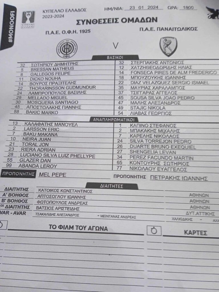 Αρχική Παναιτωλικός Η ενδεκάδα του Παναιτωλικού με αντίπαλο τον ΟΦΗ (23/1) Παναιτωλικός Η ενδεκάδα του Παναιτωλικού με αντίπαλο τον ΟΦΗ (23/1) Από giannis - 23 Ιανουαρίου 2024 FacebookXPinterestWhatsApp Δείτε τους ποδοσφαιριστές που επέλεξε ο Γιάννης Πετράκης για την αναμέτρηση του κυπέλλου με αντίπαλο τον ΟΦΗ ΠΑΡΟΜΟΙΑ ΑΡΘΡΑΠΕΡΙΣΣΟΤΕΡΑ ΑΠΟ ΤΟΝ ΔΗΜΙΟΥΡΓΟ 2ο Επιμορφωτικό Σεμινάριο Ακαδημίας Παναιτωλικού με σημαντικές παρουσίες από τον χώρο του ποδοσφαίρου Παναγιώτης Στεργίου: «Δεν πάει άλλο, η ΕΠΣ Αιτωλοακαρνανίας χρειάζεται άμεσα επανεκκίνηση» Παναιτωλικός: Πρόωρο τέλος η χρονιά για τον Γκαρσία Ροή ειδήσεων ΕΠΣ Αιτ/νίας : Επιτυχημένη ολοκλήρωση της σχολής διαιτησίας με 11 νέους... 30 Απριλίου 2026 Από τα καπνοχώραφα στο εθνόσημο: Η Στέλλα Ντζάνη νίκησε τη ζωή... 30 Απριλίου 2026 Μπουχαλάκης: Το κορυφαίο γκολ των playouts σύμφωνα με τους φιλάθλους 30 Απριλίου 2026 Μαρτίνεθ: «Γίγαντας ο Παναθηναϊκός, έχει φτιαχτεί για να κατακτήσει τη Euroleague» 30 Απριλίου 2026 Final 4 Conference Cup: Η ευρωπαϊκή «γιορτή» του πόλο στο Ρέστειο... 30 Απριλίου 2026