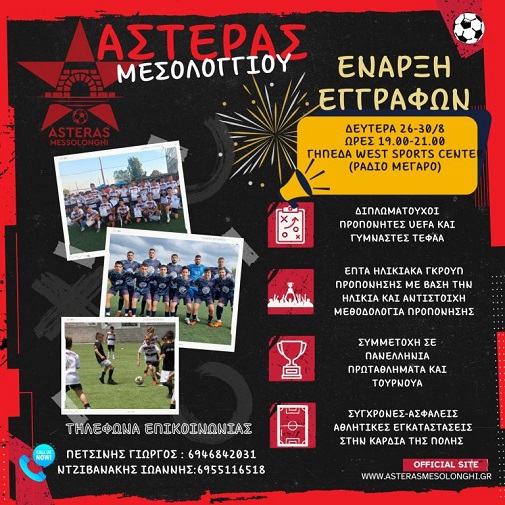 Ξεκινούν σήμερα, Δευτέρα 26 Αυγούστου 2024, οι εγγραφές των παιδιών στην Ακαδημία ποδοσφαίρου Αστέρα Μεσολογγίου, στις εγκαταστάσεις του West Sports Center (όπισθεν του Ραδιοφωνικού Σταθμού Μεσολογγίου).