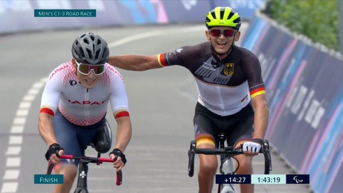 Τρομερή στιγμή στον αγώνα ποδηλασίας, με δύο αθλητές, από την Ιαπωνία και τη Γερμανία αντίστοιχα, να τερματίζουν χέρι-χέρι, χαρίζοντάς μας μία πανέμορφη εικόνα.