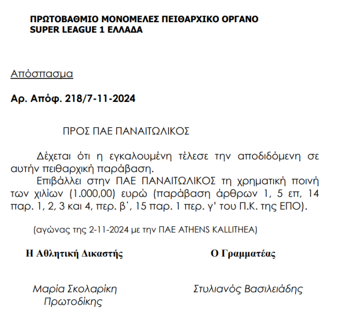 Το Πρωτοβάθμιο Μονομελές Πειθαρχικό όργανο τιμώρησε την ΠΑΕ Παναιτωλικός με πρόστιμο 1000 ευρώ , για τα υβριστικά συνθήματα των φιλάθλων στο ματς με την Καλλιθέα.