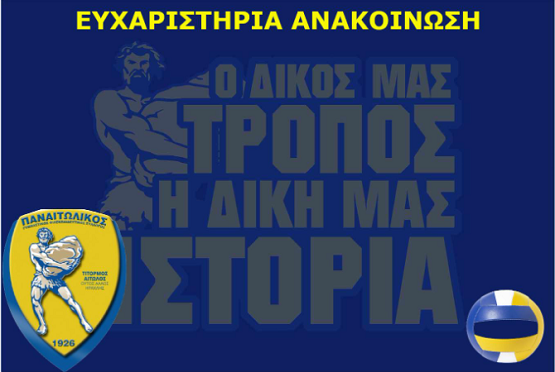 Η Διοίκηση και η ομάδα βόλεϊ του Γ.Φ.Σ. ΠΑΝΑΙΤΩΛΙΚΟΥ επιθυμούν να εκφράσουν τις θερμές τους ευχαριστίες στον Πρόεδρο, το Διοικητικό Συμβούλιο και το προπονητικό επιτελείο της ομάδας ΕΛΠΙΔΕΣ ΛΕΥΚΑΔΑΣ για τη στήριξη και τη βοήθειά τους προς τις αθλήτριές μας Αλεξάνδρα Κατσιπάνου και Μαριαλένα Μαρούσκου, κατά τη μεταφορά τους στο Νοσοκομείο Λευκάδας μετά τον τραυματισμό τους στο μεταξύ μας αγώνα. Ευτυχώς οι αθλήτριές μας δεν υπέστησαν κάποιο σοβαρό τραυματισμό και αυτό μας χαροποιεί ιδιαίτερα.