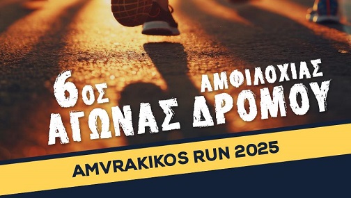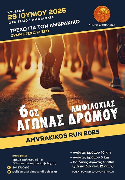 Ο Δήμος Αμφιλοχίας διοργανώνει την Κυριακή 29 Ιουνίου 2025 τον 6ο Αγώνα δρόμου Αμφιλοχίας 10 και 5 km για ενήλικες και 1000m για μαθητές δημοτικού (6-12 ετών) στην παραλία της Αμφιλοχίας.