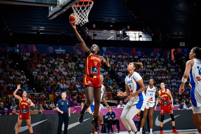 Η Γαλλία αντιμετώπιζε πολλά προβλήματα στην επίθεση (σ.σ. 4 πόντοι σε 4 λεπτά) και έμεινε πίσω με 5 πόντους, 55-50. Οι “τρικολόρ” με την Αγιαγί να σκοράρει τέσσερις πόντους, μείωσαν στο πόντο, 55-54 με 5 λεπτά να απομένουν για το τέλος. Η Φαμ με τρίποντο έδωσε ανάσα στην Ισπανία για το 58-54, αλλά η Γαλλία απάντησε με δίποντο της Τουρέ για το 58-56. Η “φούρια ρόχας” με νέο τρίποντο από την Μπουεναβίδα πήρε αέρα πέντε πόντων, 61-56 με 2′ και 40” να απομένουν. Τρεις βολές της Σαλόν και ένα τρίποντο της Μπενί έδωσε προβάδισμα στην Γαλλία, 62-61. Η Ισπανία με καλάθι της Ορτίθ, αλλά και δύο βολές της Τόρενς έκανε το 65-62 για την χώρα της με 16,3” να απομένουν. Η Γαλλία είχε την ευκαιρία με την Ρουπέρ στα 0,8” να στείλει το ματς στην παράταση, αλλά η Γαλλίδα ψηλή αστόχησε στην δεύτερη βολή. Αυτό είχε ως αποτέλεσμα η Ισπανία να επικρατήσει με 65-64 και να προκριθεί στον τελικό.
