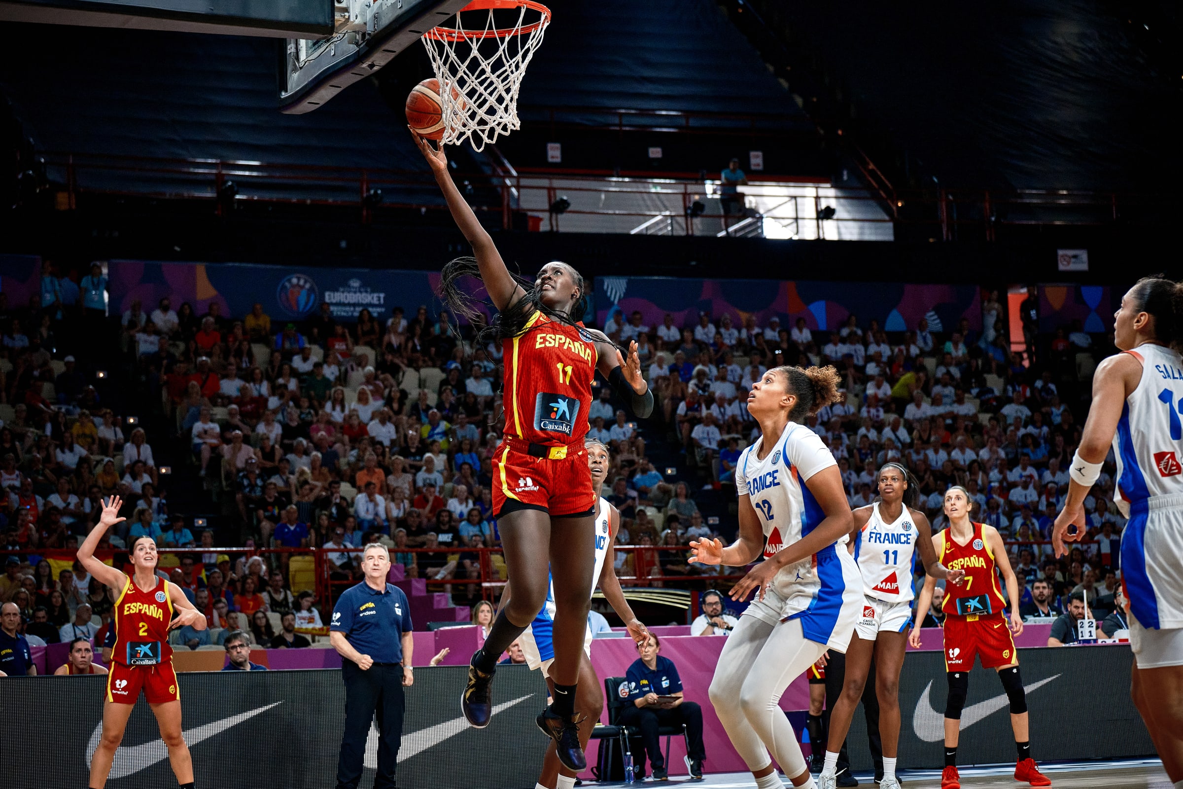 Η Λακάν με τέσσερις πόντους και η Μπαντιάν με τρεις έδωσαν αέρα 5 πόντων στην Γαλλία, 25-20. H Καρέρα με τρίποντο μείωσε για την Ισπανία σε 25-23. Η ασημένια Ολυμπιονίκης ωστόσο έβγαζε τρομερή ενέργεια στην άμυνα και με την Αγιαγί που έφτασε νωρίς στους 11 πόντους, έκανε το 29-23 στο 14′. H ομάδα του Τουπάν όσο παιρνούσε η ώρα στον αγώνα έβγαζε ολοένα και περισσότερη ενέργεια και με καλάθι της Σαλόν έκανε το 34-25. Η Γαλλία άντεξε μέχρι το τέλος του πρώτου μέρους και πήγε στα αποδυτήρια στο συν 7, 38-31, παρόλο που ήταν αρκετά άστοχη από την περιφέρεια, εκτελώντας με το χαμηλό 3/13 τρίποντα (23%).