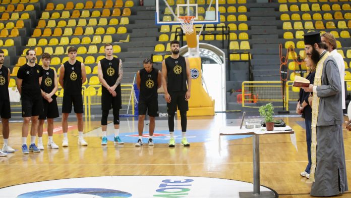 Ο πάτερ Ιάκωβος ράντισε όλους τους παρευρισκόμενους, αλλά και τους χώρους του γηπέδου και ευχήθηκε στην ομάδα “καλή επιτυχία”.