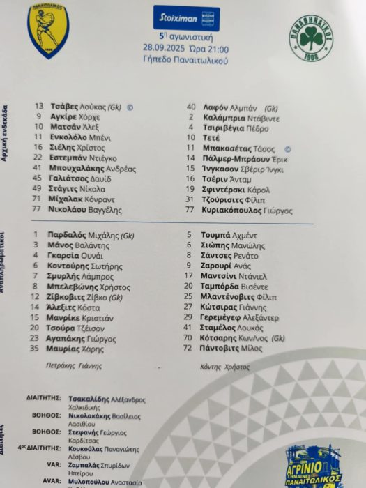 ![Μπορεί να είναι εικόνα κείμενο που λέει "STOIXIMAN SUPERLEAGUE SUPER LEAGUE 2025-2026 YARINATE 1908 13 45 16 49 CHAVES (] GALIATSOS SHELIS STAJIC 77 NIKOLAOU BOUCHALAKIS 11 NIKOLOLO ESTEBAN MATAN 41 zz u اهة SETEE 黛 ATPINIO ΠΑΝΑΙΤΩΛΙΚΟΣ ΠΑΝΑΙ ΟΣ 10 71 9 MICHALAK AGUIRRE SUBSTITUTES 1 PARDALOS (GK) MANOS GARCIA- KONTOURIS SMYRLIS BELEVONIS 12 ZIVKOVIC (GK] 4ALEKSIC 15 MANRIQUE 20 CHURA 23 AGAPAKIS 35 MAVRIAS novibet"](https://scontent.fath2-1.fna.fbcdn.net/v/t51.82787-15/554817587_18502927414069976_1587169537813852847_n.jpg?_nc_cat=109&ccb=1-7&_nc_sid=127cfc&_nc_ohc=2vWjl_Vw6tEQ7kNvwFjnay6&_nc_oc=Adn9vr2-_yXhuJZcFr_PRf1VU8XwD9XBjzWZptgMATydmLBQfJo1m_iipOINtws7NetUEtx84ucmxZd4kMZ2V1OB&_nc_zt=23&_nc_ht=scontent.fath2-1.fna&_nc_gid=HNXXHevTGwEfXcAbr0hdIA&oh=00_AfYat2EvdunUjFy9-O5YUYxXkiN2PIBxtvLC0s1iemCBxA&oe=68DF3FC9)