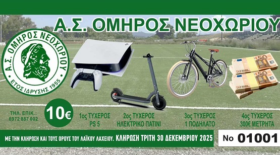 Ο Αθλητικός Σύλλογος Όμηρος Νεοχωρίου ανακοινώνει τη διοργάνωση λαχειοφόρου κλήρωσης με πλούσια δώρα, στηρίζοντας παράλληλα τη λειτουργία και τις δραστηριότητες του συλλόγου.