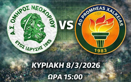Σε ένα ιδιαίτερα σημαντικό παιχνίδι για τη συνέχεια του πρωταθλήματος της Β΄ Κατηγορίας, ο Όμηρος Νεοχωρίου υποδέχεται την Κυριακή 8 Μαρτίου στις 15:00 τον Προμηθέα Χάλκειας, στο πλαίσιο της 16ης αγωνιστικής του 2ου ομίλου.