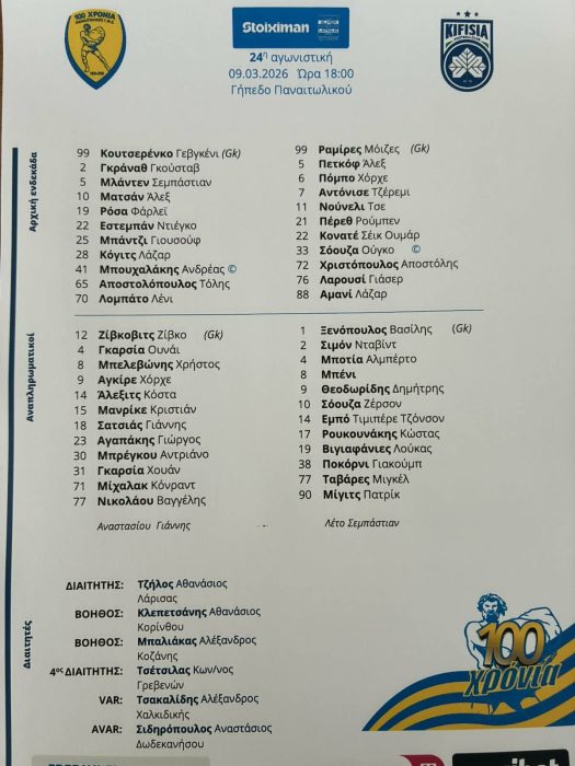 Αρχική Παναιτωλικός Παναιτωλικός – Κηφισιά : Οι συνθέσεις των δυο ομάδων (9/3) Παναιτωλικός Παναιτωλικός – Κηφισιά : Οι συνθέσεις των δυο ομάδων (9/3) Από giannis - 9 Μαρτίου 2026 FacebookTwitterPinterestWhatsApp Οι ποδοσφαιριστές που επέλεξε ο Γιάννης Αναστασίου για την εντός έδρας αναμέτρηση με την Κηφισιά. Ώρα έναρξης στις 18.00 ΠΑΡΟΜΟΙΑ ΑΡΘΡΑΠΕΡΙΣΣΟΤΕΡΑ ΑΠΟ ΤΟΝ ΔΗΜΙΟΥΡΓΟ Παναιτωλικός: Τα χαμένα πέναλτι που κόστισαν πολύτιμους βαθμούς! Φάρλεϊ Ρόσα : Δεν σκύβω το κεφάλι – στο επόμενο παιχνίδι θα κάνω τη διαφορά! Αναστασίου: «Πρέπει να βρούμε λύσεις και να επιστρέψουμε άμεσα στα θετικά αποτελέσματα» Ροή ειδήσεων Premier League (34η αγωνιστική): Πριν την Ευρώπη, υπάρχει η παραμονή 24 Απριλίου 2026 Παναθηναϊκός: Τα συγχαρητήρια της ΠΑΕ και της ΚΑΕ για την κατάκτηση... 24 Απριλίου 2026 Οι σημαντικότερες στιγμές του Στουτγκάρδη – Φράιμπουργκ (videos) 24 Απριλίου 2026 Θύρα 6 – Warriors : Σεβασμός στη φανέλα, στην ιστορία, στον... 23 Απριλίου 2026 Live Streaming: Στουτγκάρδη – Φράιμπουργκ 23 Απριλίου 2026