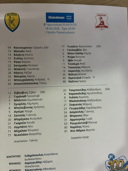 Αρχική Επικαιρότητα Παναιτωλικός-Πανσερραϊκός : Οι συνθέσεις των δυο ομάδων (18/4) Επικαιρότητα Παναιτωλικός-Πανσερραϊκός : Οι συνθέσεις των δυο ομάδων (18/4) Από giannis - 18 Απριλίου 2026 FacebookTwitterPinterestWhatsApp Δείτε τους ποδοσφαιριστές που επέλεξε ο Γιάννης Αναστασίου για την εντός έδρας αναμέτρηση με τον Πανσερραϊκό. Ώρα έναρξης στις 20.00 ΠΑΡΟΜΟΙΑ ΑΡΘΡΑΠΕΡΙΣΣΟΤΕΡΑ ΑΠΟ ΤΟΝ ΔΗΜΙΟΥΡΓΟ Α΄κατηγορία : Ο Παναγρινιακός πρωταθλητής – Αποτελέσματα 4ης αγωνιστικής Play-Offs Ναυπακτιακός Αστέρας: Μεγάλο διπλό στον Αμφίλοχο και άνοδος στην Α’ Κατηγορία Νίκη παραμονής για τον Ατρόμητο Αντιρρίου, στη Β’ Κατηγορία ο ΑΟ Λυγιάς Ροή ειδήσεων Α΄κατηγορία : Ο Παναγρινιακός πρωταθλητής – Αποτελέσματα 4ης αγωνιστικής Play-Offs 18 Απριλίου 2026 Ναυπακτιακός Αστέρας: Μεγάλο διπλό στον Αμφίλοχο και άνοδος στην Α’ Κατηγορία 18 Απριλίου 2026 Νίκη παραμονής για τον Ατρόμητο Αντιρρίου, στη Β’ Κατηγορία ο ΑΟ... 18 Απριλίου 2026 Πανδαιμόνιο στην “Allwyn Arena” πριν από την προπόνηση της ΑΕΚ (video) 18 Απριλίου 2026 ΕΠΣ Αιτ/νίας : Live οι αγώνες του Σαββάτου 18 Απριλίου 18 Απριλίου 2026